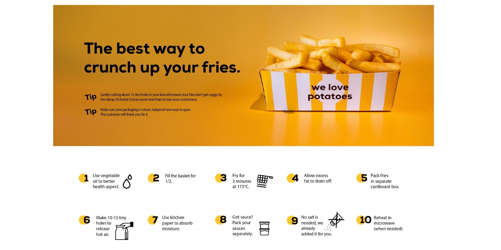 CONSEJO 2: Haz unos 10 agujeritos en la caja para que las patatas fritas no se empapen con la humedad. Es mejor perder un poco de calor que perder su crujiente.