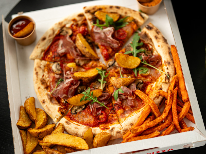 El encanto rústico de la cocina italiana con la abundante esencia de papas. Imagine una masa de pizza estirada a mano, horneada a la perfección, cubierta con tomates madurados al sol, aromática albahaca y una generosa capa de mozzarella. ¿El toque? Una corona de trozos crujientes y sazonados con piel, que añaden un crujido satisfactorio y una explosión de sabor. Como guarnición, las patatas fritas dulces de papa ponen la nota dulce y salada a esta escapada italiana.