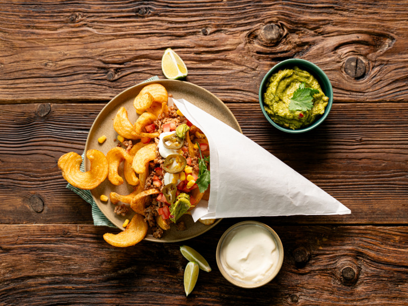 Una fiesta de sabores mexicanos donde las patatas fritas Sidewinders® patentadas por Agristo se convierten en la estrella del espectáculo. Estas patatas fritas con un doble toque se combinan con pollo a la parrilla, ensalada de col con lima y un chorrito de mayonesa de chipotle. Es un giro divertido a la clásica noche de tacos, con las Sidewinders como inesperado sustituto textural, dando un toque moderno a este amado alimento básico mexicano.