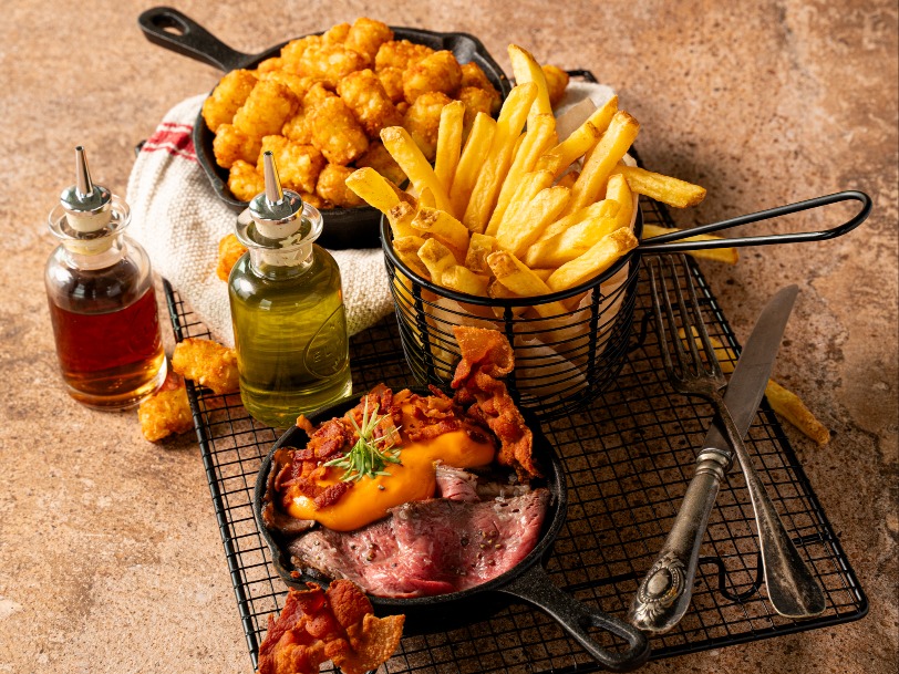 Sumérjase en el corazón de la comida reconfortante americana con dos platos. En primer lugar, las patatas fritas con carne de pecho: una montaña de patatas fritas doradas, cubiertas con carne de pecho tierna y cocinada a fuego lento, bañadas en una salsa barbacoa ahumada y acabadas con una pizca de queso cheddar y cebollino fresco. A continuación, los mini hash brown crujientes: estas delicias del tamaño de un bocado son el complemento perfecto para cualquier plato, con un exterior dorado y crujiente y un interior esponjoso, listos para mojar en la salsa que prefiera o para disfrutarlos solos.