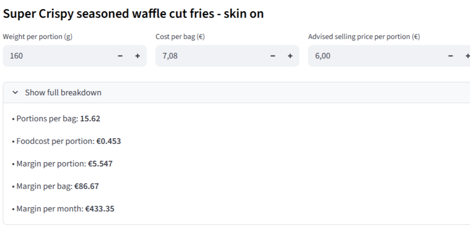 We zullen je dubbelzinnige theorieën over marges besparen. We weten het, chef-koks willen gewoon bewijs. Met onze winstcalculator zit het bewijs in de pudding, of eigenlijk in de friet. Met een paar snelle inputs krijg je de echte cijfers: hoeveel extra winst kun je maken door je menu uit te breiden met eersteklas aardappelgeïnspireerde bijgerechten. Geen pluisjes. Geen giswerk. Volledige duidelijkheid.